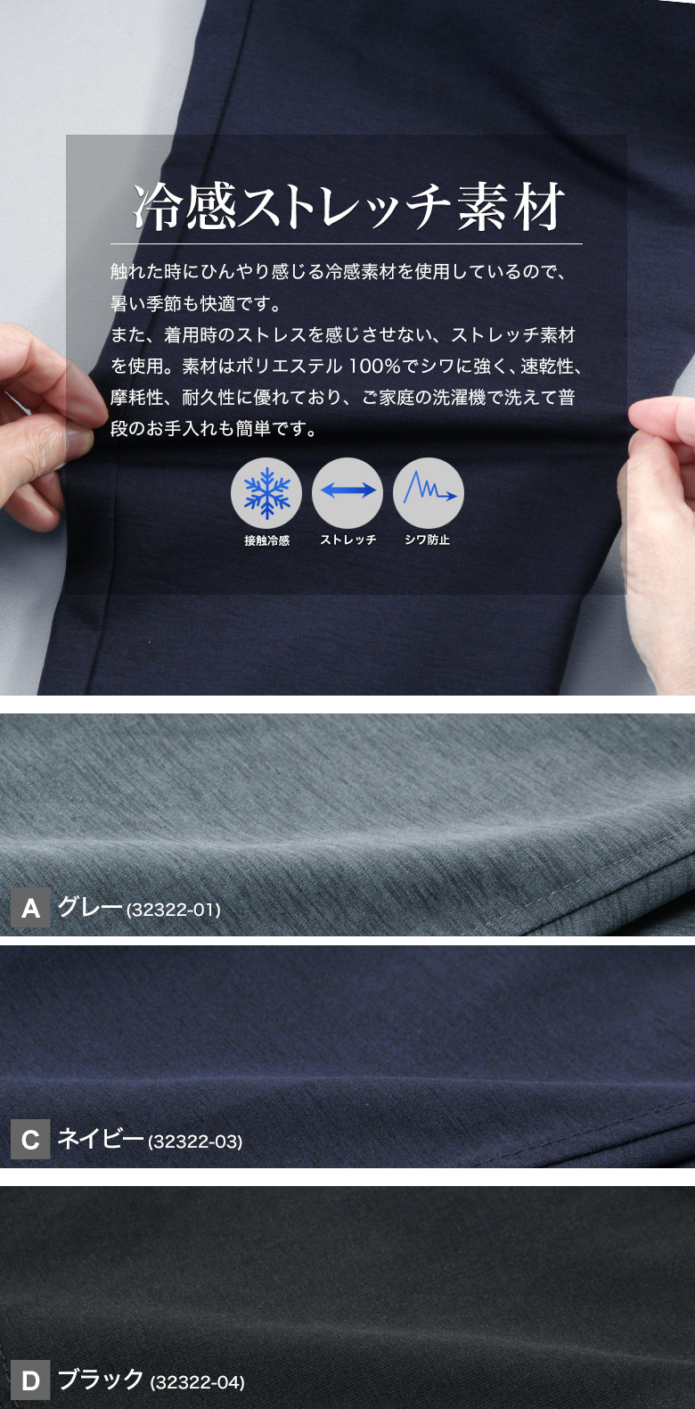 冷感素材を使用した、快適なはき心地のカジュアルストレッチパンツ。ひんやりとした肌触りと優れたストレッチ性で、長時間の着用でもストレスフリーに過ごせます。