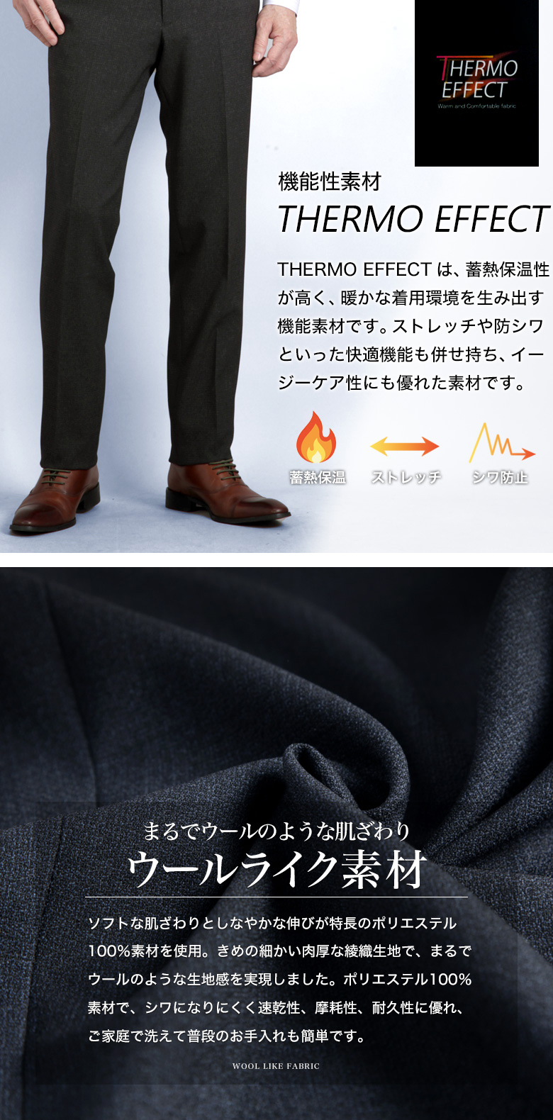 股下サイズ70・73・76cmから選ぶことができ、裾上げをする手間がなく、届いてすぐに着られます。蓄熱保温性が高く、暖かな着用環境を生み出す機能性素材「THERMO EFFECT」を使用したスラックス。ソフト暖かみのあるウールライク素材を使用しています。ストレッチ性があり、ストレスを感じず着用感も快適です。防シワ性に優れているので、ご家庭で洗えていつも清潔に保てます。お手入れ簡単イージーケアな商品です。