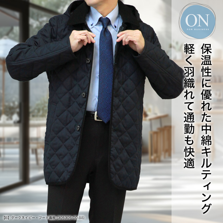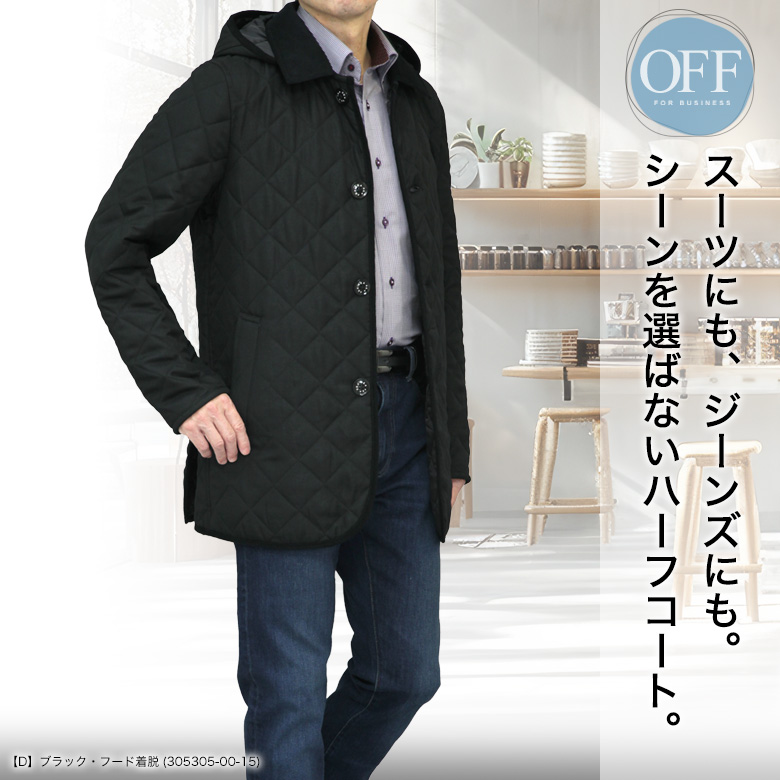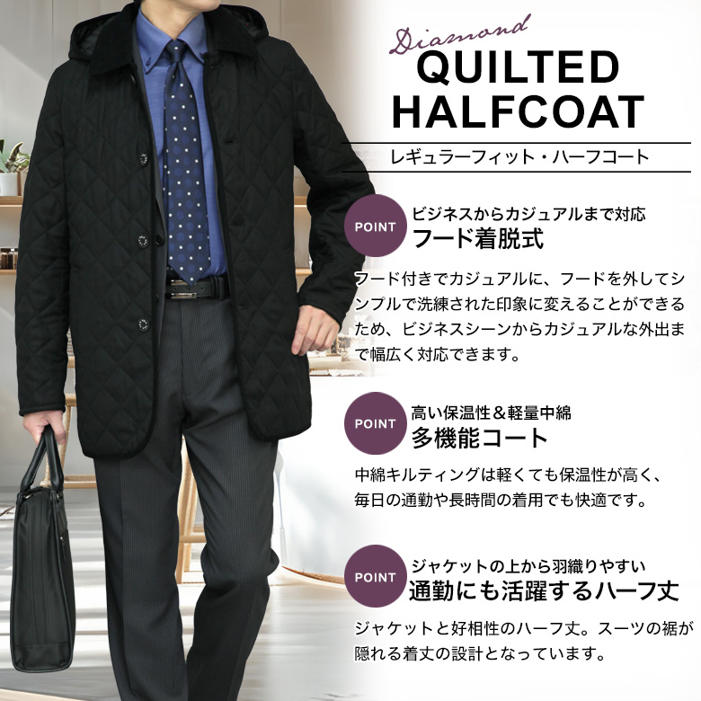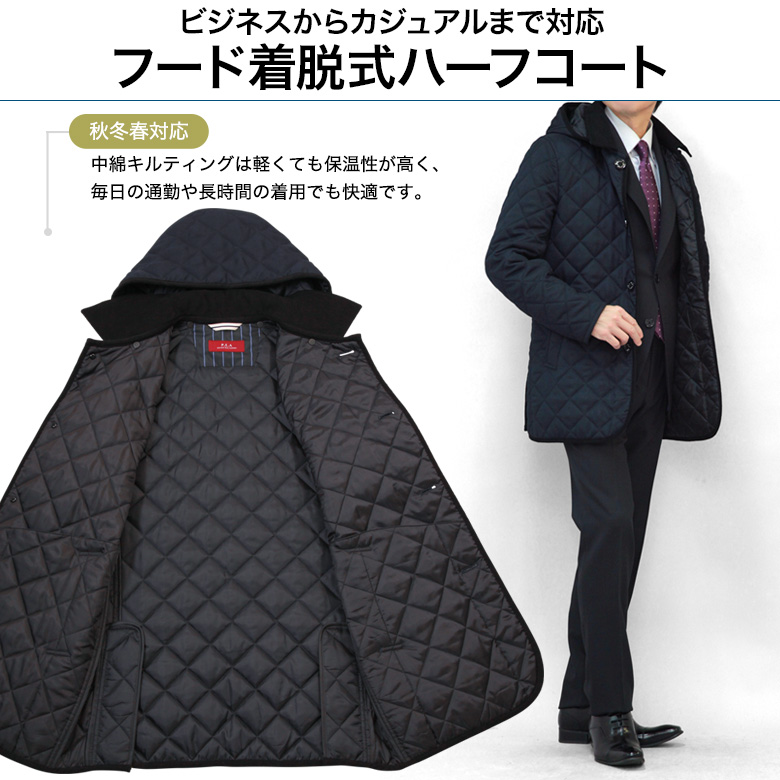 キルティングコート><ハーフコート><中綿コート><フード着脱><フード付きコート><メンズアウター>< ビジネスカジュアル><通勤コート><スーツ対応><デニム対応><きれいめカジュアル><秋冬アウター><防寒><軽量><メンズコート><ビジネスコート><秋・冬・春><ハーフコート><ブラック・ネイビー><M・L・LL・3L><KOKUBO><コクボ><こくぼ>