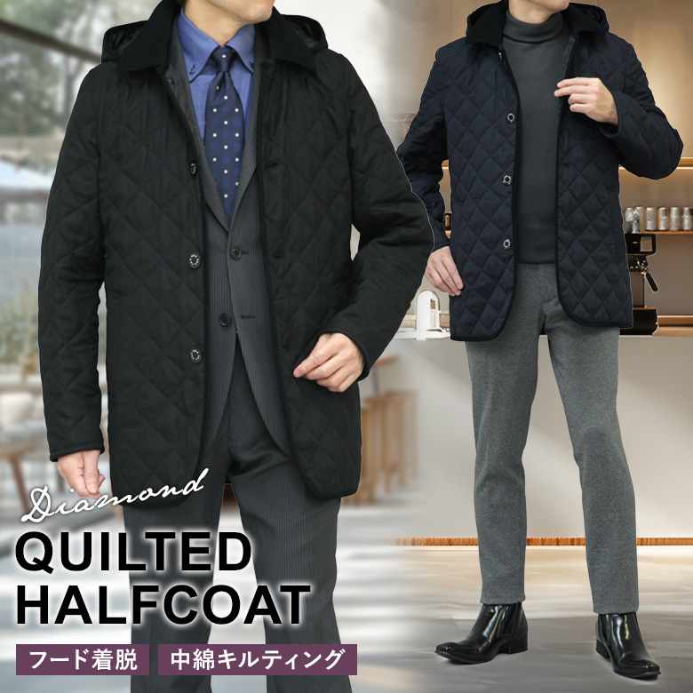 フードの着脱で表情を変えられる、中綿入りキルティングハーフコート。 ダイヤ柄のキルティングが上品な印象を演出し、スーツやジャケットスタイルにはもちろん、ジーンズを合わせたカジュアルなコーディネートにも自然に馴染みます。