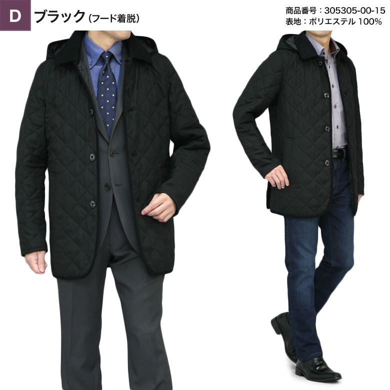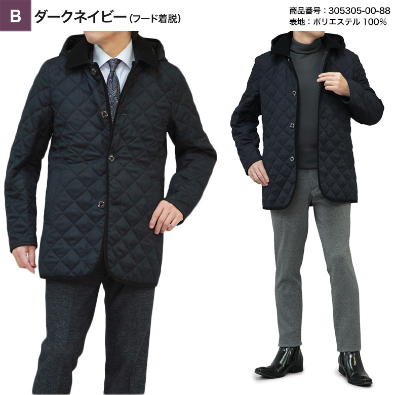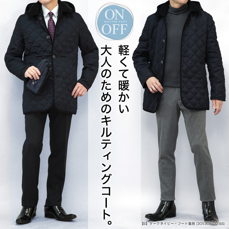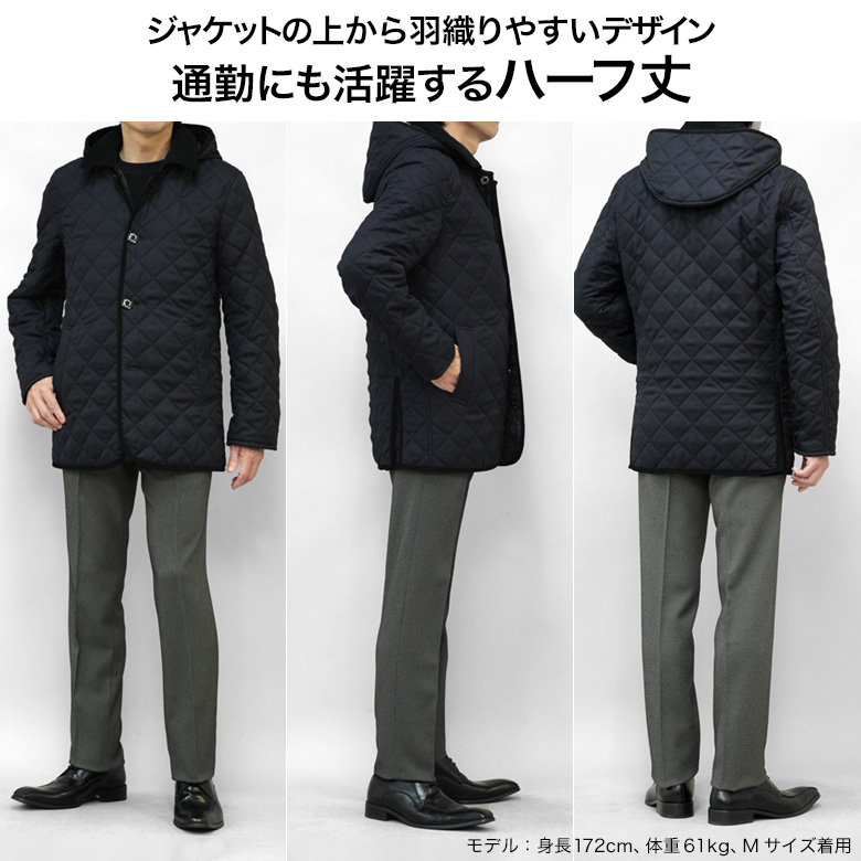 スーツの上から軽快に羽織れて軽快 暖かい保温性のあるダイヤキルトでビジネスからカジュアル オンオフ使えるキルティング ハーフコート メンズ スタンドカラー&衿フード付 タイプ キルティングジャケット ダイヤキルト ブリティッシュ ビジネスカジュアル 秋冬春 オシャレ