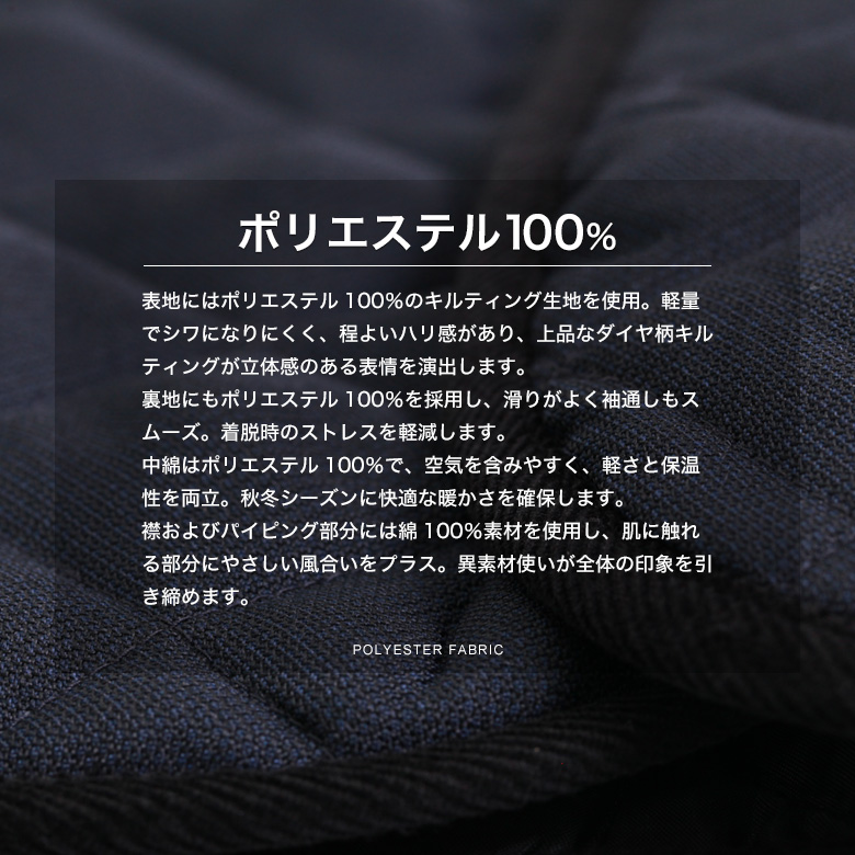 ダイヤ柄のキルティングが上品な印象を演出し、スーツやジャケットスタイルにはもちろん、ジーンズを合わせたカジュアルなコーディネートにも自然に馴染みます。