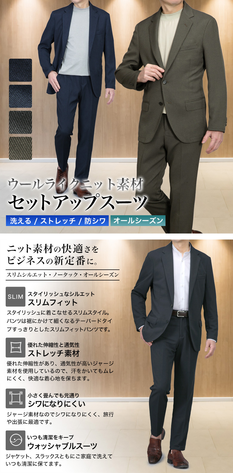 ストレッチ性に優れたウールライクニット素材を使用。スーツ専門店が仕立てたカジュアルセットアップスーツ。セットアップスーツ 上下セット ウールライク ストレッチニット素材 スーツ仕立て スーツ ノータック ストレッチ 上下洗える ウォッシャブル 防シワ カジュアル ビジネス 春夏秋冬 リモートワーク おしゃれ