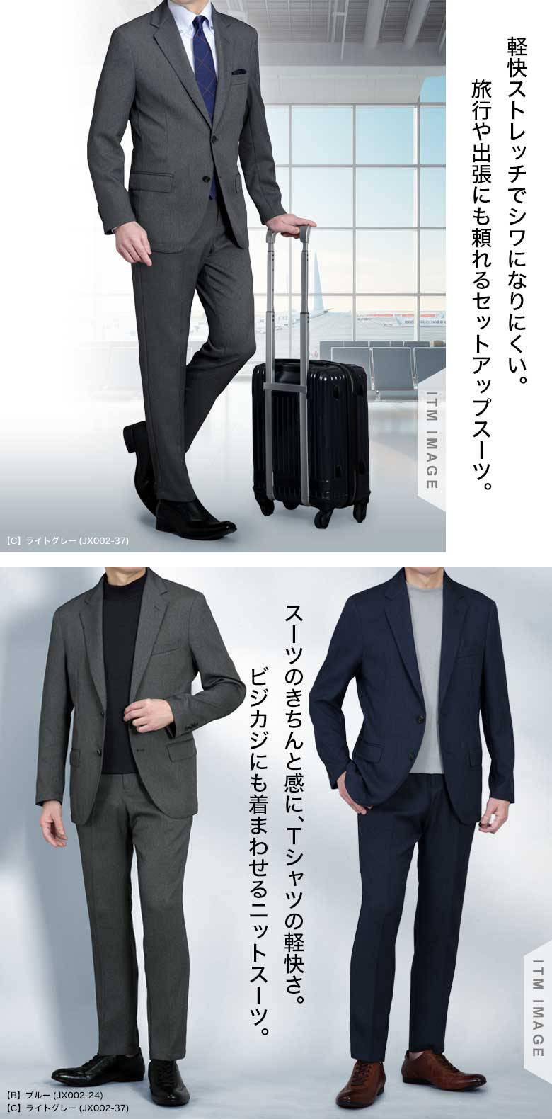 ウールのような上品な表情を持つ「ウールライクニット素材」を使用したカジュアルセットアップスーツ。ニットならではの高いストレッチ性で動きやすく、長時間の着用でも快適な着心地を実現します。さらにシワになりにくい素材のため、出張や旅行、日常使いでも扱いやすく、きれいな印象をキープします。