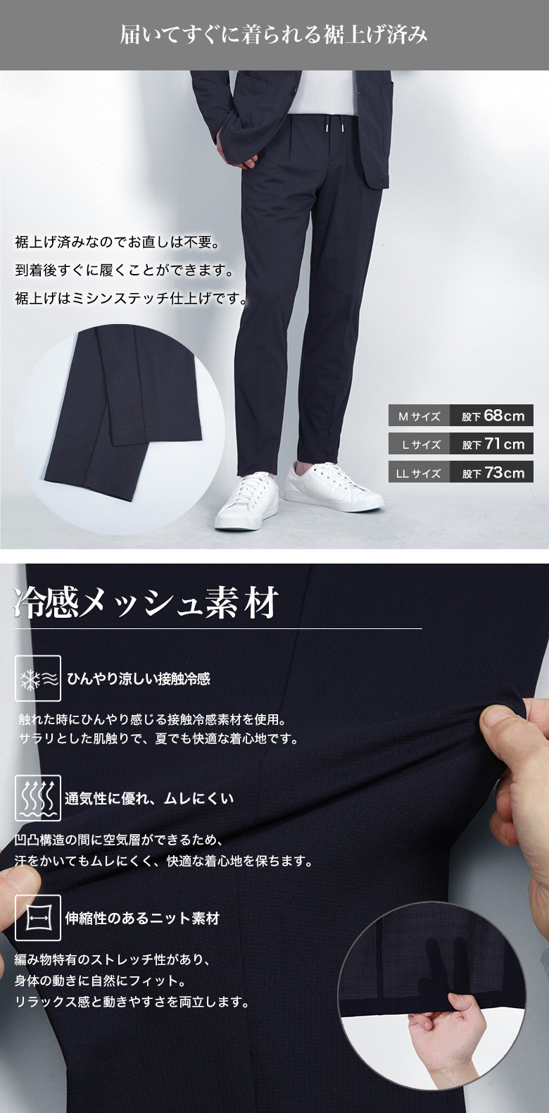冷感メッシュ素材を使用したセットアップスーツ。ひんやりとした接触冷感で夏でも快適な着心地です。ストレッチ生地により、動きやすさと快適さを兼ね備えています。ご家庭の洗濯機で洗えて、お手入れも簡単です。