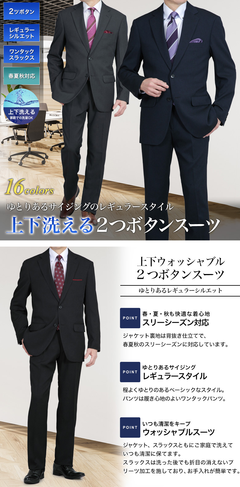 トップページ > ビジネススーツ > 春夏秋・スーツ > スーツ メンズ レギュラーフィット 2つボタン 春夏秋 ウォッシャブルスーツ 上下洗える ワンタック プリーツ加工 ポリエステル100% ビジネススーツ メンズスーツ