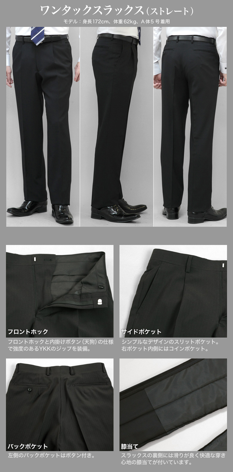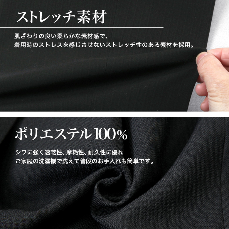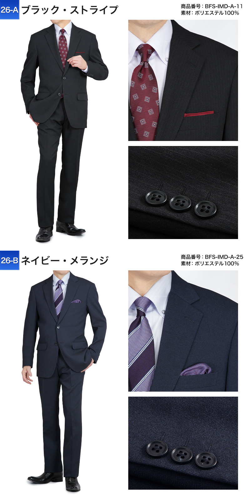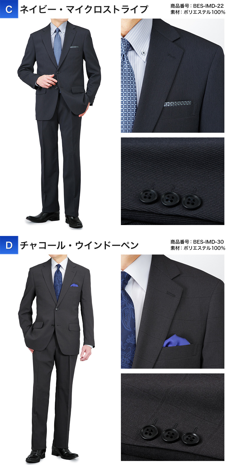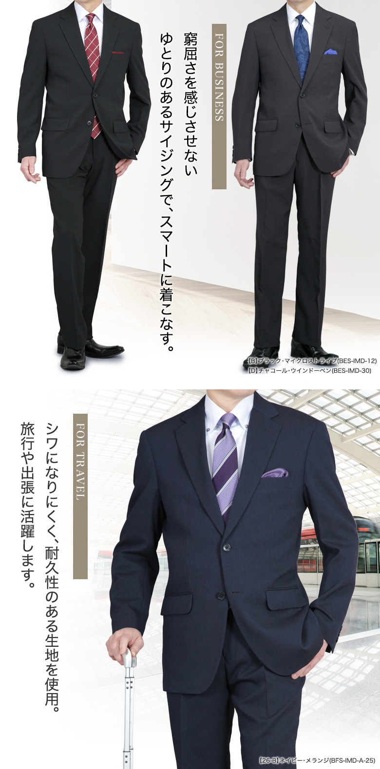 全体にゆとりのあるシルエット、落ち着いた大人のビジネスマンにおすすめです。ジャケットは背抜き仕立てで春夏秋のスリーシーズン対応で長期間ご着用いただけます。スラックスはワンタックでヒップ、腰周りに程よくゆとりのあるすっきりとしたシルエット。長時間のビジネスワークにもストレスを感じさせないシルエットに仕上げております。素材はシワに強く耐久性、速乾性に優れたポリエステル100%素材でお手入れも簡単、メンテナンス、コストパフォーマンスに優れた素材となります。 |