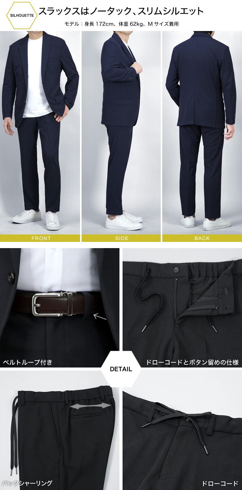 ビジネスカジュアルから休日スタイルまで幅広く活躍する、機能性とデザイン性を兼ね備えたセットアップスーツです。 |
