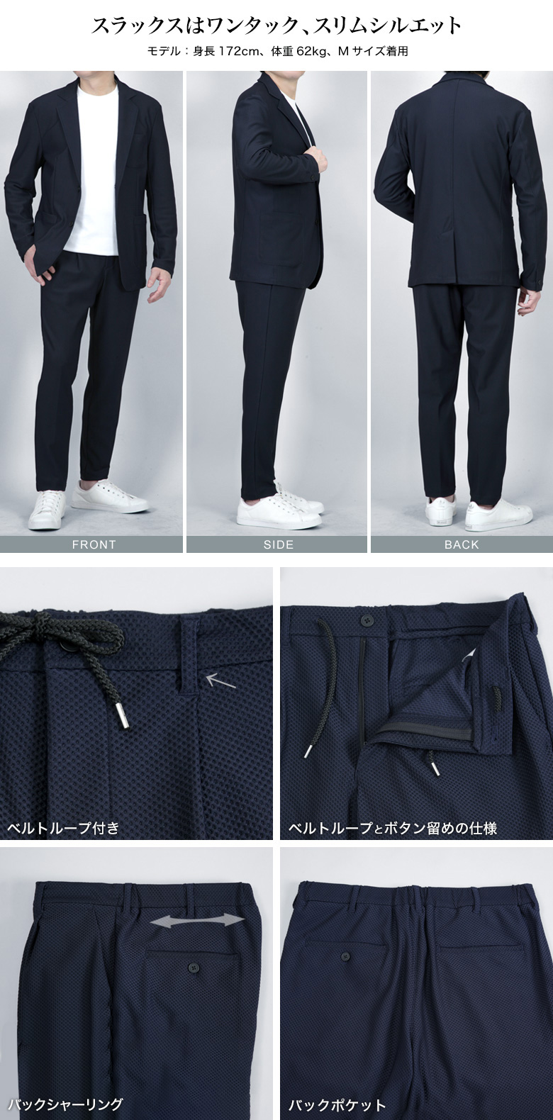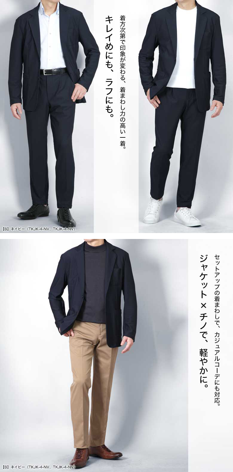 セットアップとしての着用はもちろん、ジャケット単品でチノパンやジーンズと合わせたカジュアルスタイルにも対応。ビジネスから休日まで幅広いシーンで活躍します。