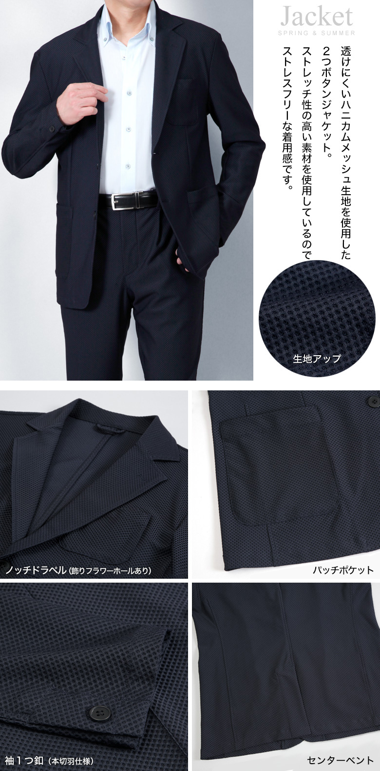 涼しくて透けにくいハニカムメッシュ素材。スーツ専門店が仕立てたカジュアルセットアップスーツ。冷感 メッシュ ストレッチスーツ カジュアルセットアップ 上下セット スーツ仕立て スリム ワンタック 背抜き メッシュ素材 クール 清涼 涼しい ストレッチ 防シワ 上下洗える ウォッシャブル テーラード テーパード カジュアル ビジネス 春夏秋 おしゃれ リモートワーク