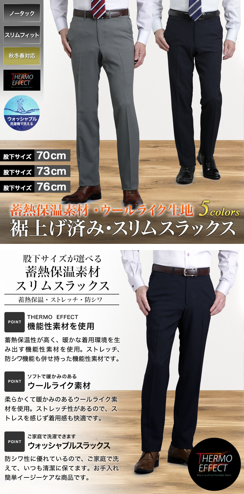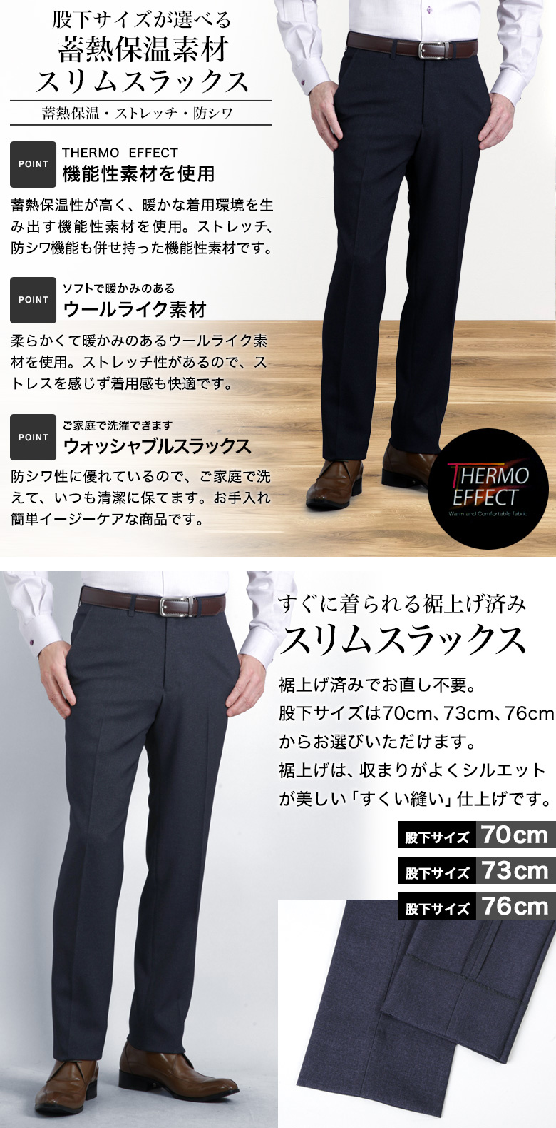 ソフトで暖かいサーモエフェクト蓄熱素材 選べる股下サイズ(70cm/73cm/76cm)裾上げ済みで裾直し不要裾上げ済み スラックス ノータック スリム ウールライク 蓄熱保温THERMO EFFECT(サーモエフォクト)ストレッチ 防シワ メンズ ウォッシャブル 洗える 暖かい 秋冬春 スリーシーズン ビジネス ビジカジ カジュアル おしゃれ 40代 50代