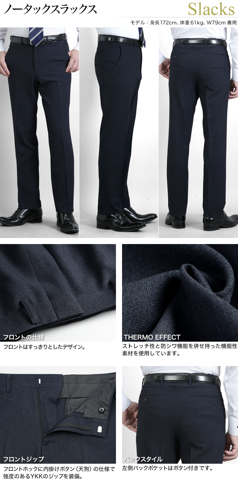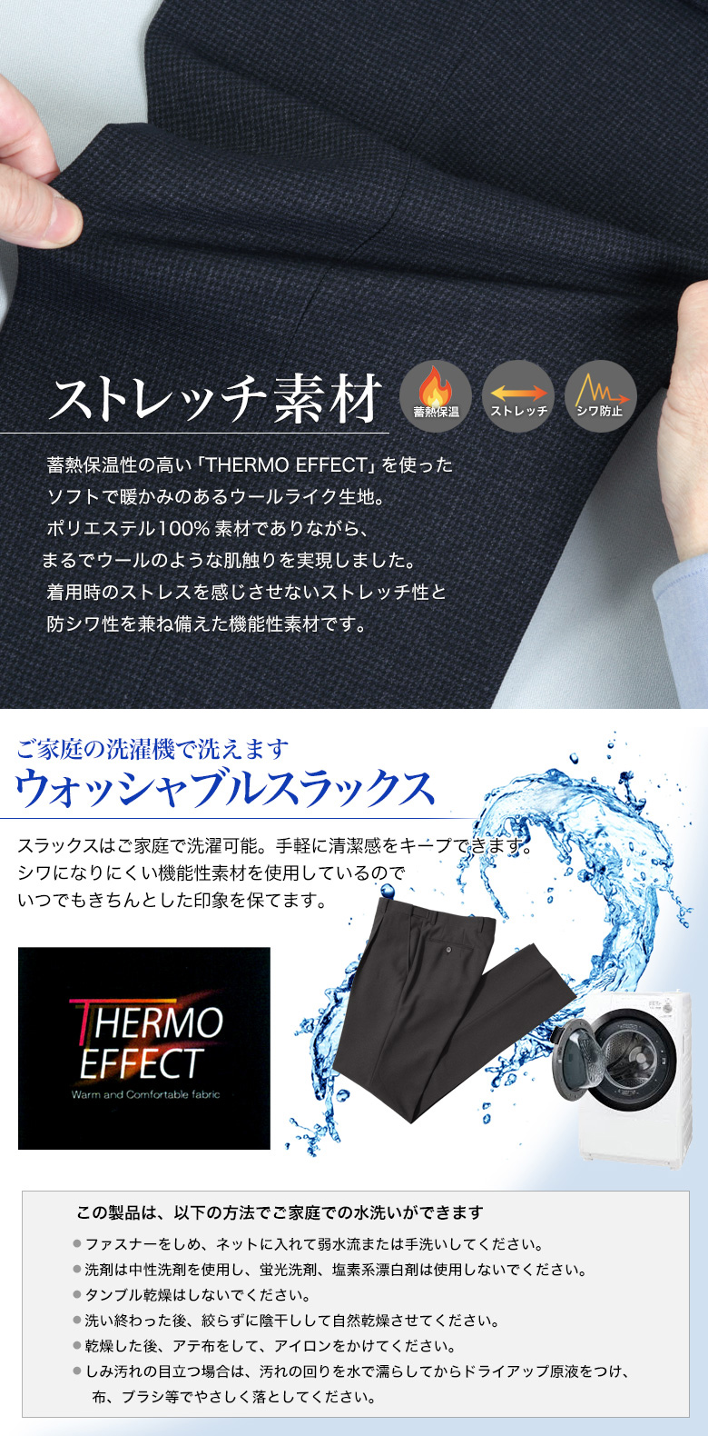 蓄熱保温性が高く、暖かな着用環境を生み出す機能性素材「THERMO EFFECT」を使用したスラックス。ソフト暖かみのあるウールライク素材を使用しています。ストレッチ性があり、ストレスを感じず着用感も快適です。防シワ性に優れているので、ご家庭で洗えていつも清潔に保てます。お手入れ簡単イージーケアな商品です。 |