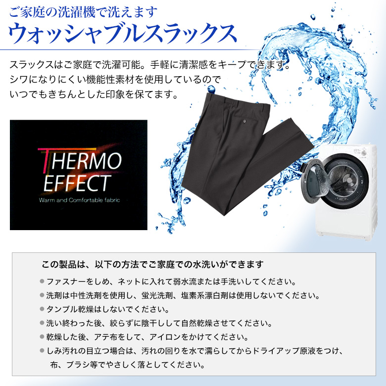 蓄熱保温性が高く、暖かな着用環境を生み出す機能性素材「THERMO EFFECT」を使用したスラックス。ソフト暖かみのあるウールライク素材を使用しています。ストレッチ性があり、ストレスを感じず着用感も快適です。防シワ性に優れているので、ご家庭で洗えていつも清潔に保てます。お手入れ簡単イージーケアな商品です。