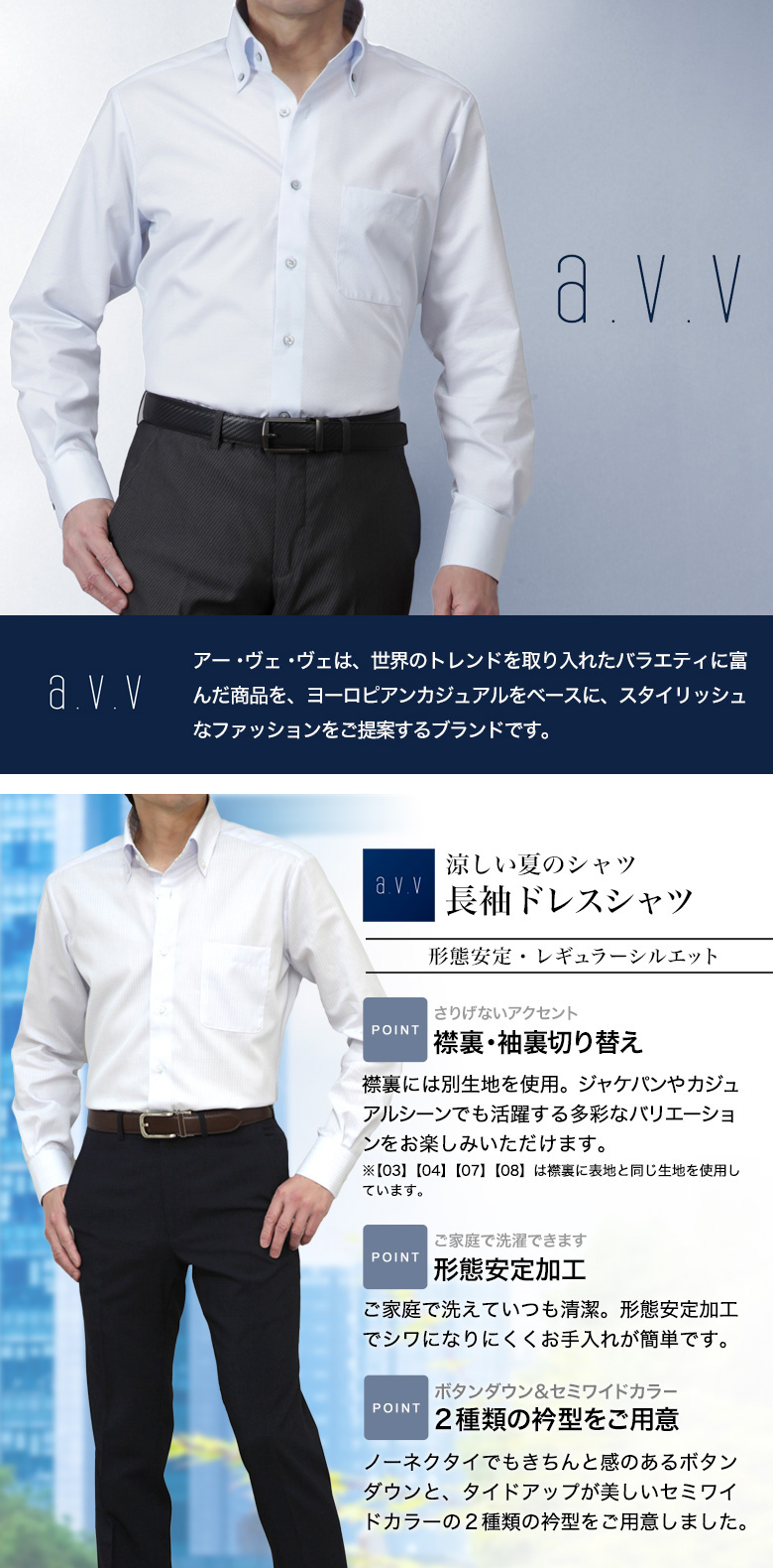 a.v.v(アーヴェヴェ) 涼しい夏のシャツです。a.v.v ワイシャツ メンズ 涼しい 長袖 ドレスシャツ 春 夏用 形態安定 ボタンダウン セミワイドカラー 襟・袖裏切り替え オシャレ ビジネス カジュアル S M L LL