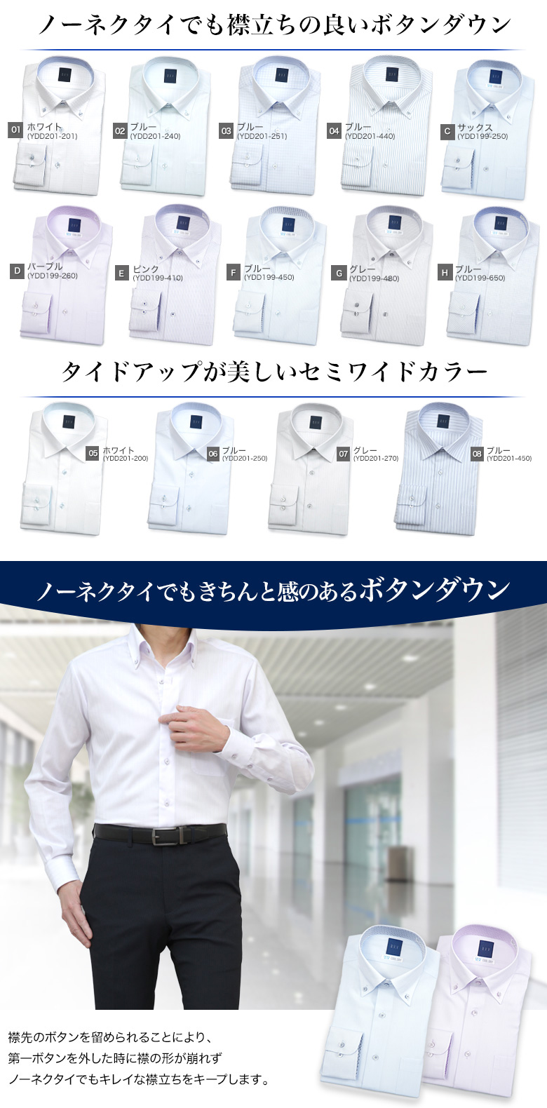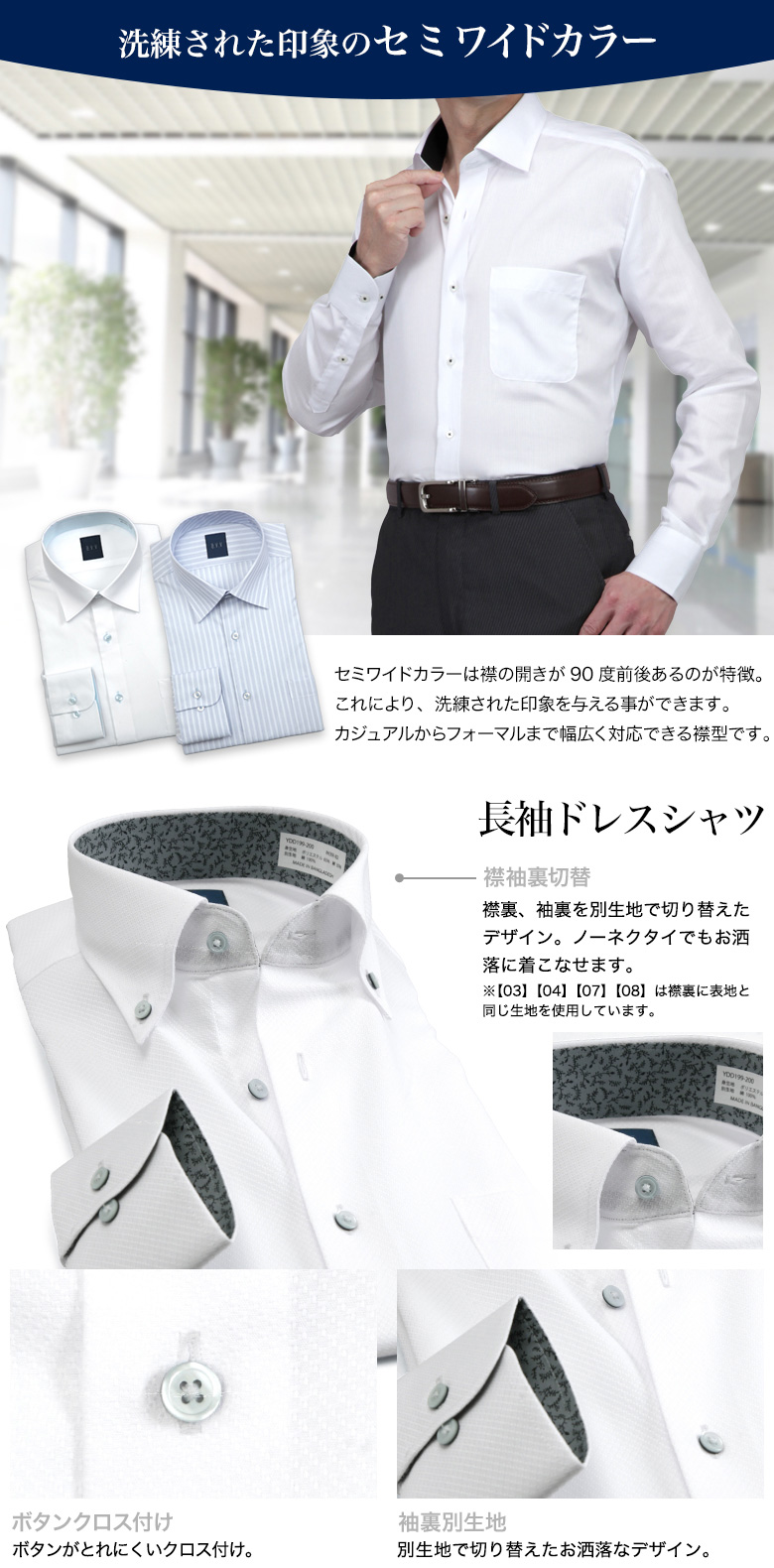 ノーネクタイでもきちんと感のあるボタンダウンと、タイドアップが美しいセミワイドカラーの2種類の衿型をご用意しました。多彩なバリエーションでスーツスタイルに限らずノーネクタイのジャケパンやカジュアルスタイルにもおすすめです。